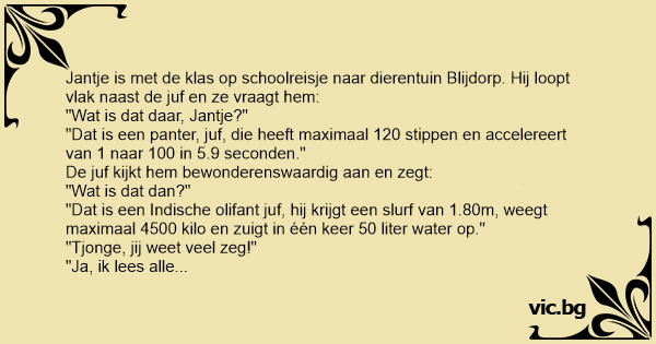 Jantje is met de klas op schoolreisje naar dierentuin Blijdorp. Hij loopt vlak naast de juf en ze vraagt hem: