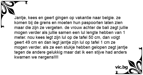 Jantje, kees en geert gingen op vakantie naar belgie. ze komen bij de grens en moeten hun paspoorten laten zien maar die zijn ze vergeten. de vrouw achter de bali zegt jullie mogen verder als jullie samen een lul lengte hebben van 1 meter. nou kees legt zijn lul op de tafel 50 cm, dan volgt geert 49 cm en dan legt jantje zijn lul op tafel 1 cm ze mogen verder. als ze een stukje hebben gelopen zegt jantje tegen de andere gelukkig maar dat ik een stijve had anders kwamen we nergens!!!!