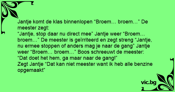 Jantje komt de klas binnenlopen “Broem… broem…” De meester zegt: “Jantje, stop daar nu direct mee” Jantje weer “Broem… broem…” De meester is geïrriteerd en zegt streng “Jantje, nu ermee stoppen of anders mag je naar de gang” Jantje weer “Broem… broem…” Boos schreeuwt de meester: “Dat doet het hem, ga maar naar de gang!” Zegt Jantje “Dat kan niet meester want ik heb alle benzine opgemaakt”