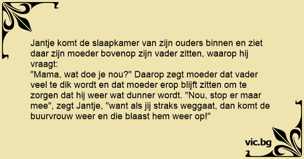 "Mama, wat doe je nou?" Daarop zegt moeder dat vader veel te dik wordt en dat moeder erop blijft zitten om te zorgen dat hij weer wat dunner wordt. "Nou, stop er maar mee", zegt Jantje, "want als jij straks weggaat, dan komt de buurvrouw weer en die blaast hem weer op!"
