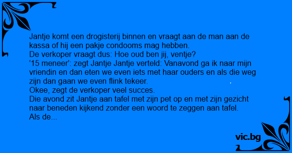 Jantje komt een drogisterij binnen en vraagt aan de man aan de kassa of hij een pakje condooms mag hebben.