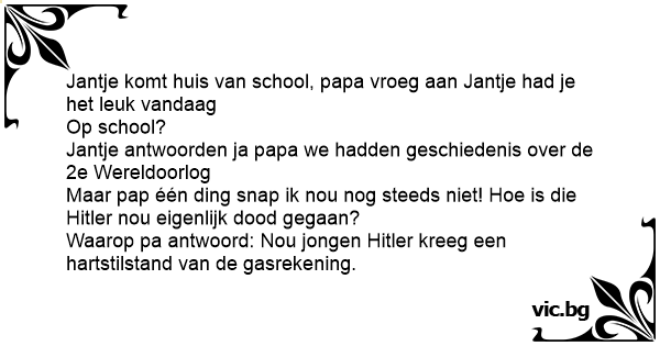 Vraag:hoe is Hitler gestorven? Antwoord:hij kreeg een hartaanval toen hij de gasrekening kreeg.
