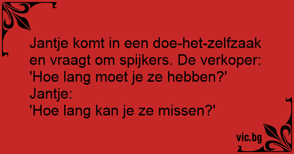 Jantje komt in een doe-het-zelfzaak en vraagt om spijkers. De verkoper: