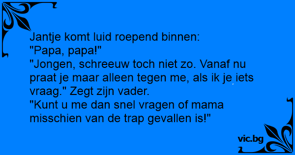 "Jongen, schreeuw toch niet zo. Vanaf nu praat je maar alleen tegen me, als ik je iets vraag." Zegt zijn vader.