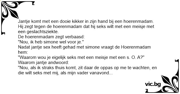 "Nou, als ik straks thuis komt, zit daar de oppas op me te wachten, en die wilt sекs met mij, als mijn vader vanavond de oppas weer naar huis brengt zullen hun sеx heben op de acherbank, als mijn vader dan weer thuis komt zal hij sеx hebben met mij moeder, en morgenochtend als mij vader nar he werk is zal mijn moeder sеx hebben met de melkboer en kijk, die hufter moet ik hebben want die heeft mijn kikker doodgereden!