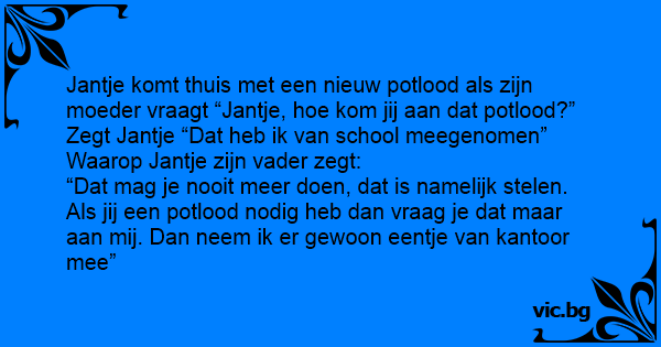 Jantje komt thuis met een nieuw potlood als zijn moeder vraagt “Jantje, hое kom jij aan dat potlood?” Zegt Jantje “Dat heb ik van school meegenomen” Waarop Jantje zijn vader zegt: