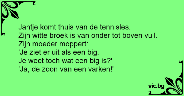 Jantje komt thuis van de tennisles.<br />Zijn witte broek is van onder tot boven vuil.<br />Zijn moeder moppert:<br />'Je ziet er uit als een big.<br />Je weet toch wat een big is?'<br />'Ja, de zoon van een varken!'