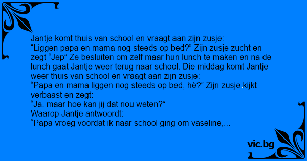 “Liggen papa en mama nog steeds op bed?” Zijn zusje zucht en zegt “Jep” Ze besluiten om zelf maar hun lunch te maken en na de lunch gaat Jantje weer terug naar school. Die middag komt Jantje weer thuis van school en vraagt aan zijn zusje: