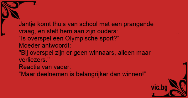 Иванчо се прибира от училище с и пита родителите си: - Мамо, изневярата олимпийски спорт ли е? - Не, при изневяра няма победители, а само губещи. - Тате? - Да, олимпийския принцип е, че участието...