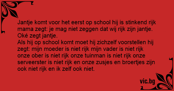 Jantje komt voor het eerst op school hij is stinkend rijk mama zegt: je mag niet zeggen dat wij rijk zijn jantje.