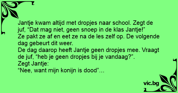 De dag daarop heeft Jantje geen dropjes mee. Vraagt de juf, “heb je geen dropjes bij je vandaag?”.