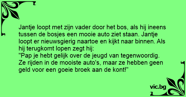 "Pap je hebt gelijk over de jeugd van tegenwoordig. Ze rijden in de mooiste auto's, maar ze hebben geen geld voor een goeie broek aan de kont!"