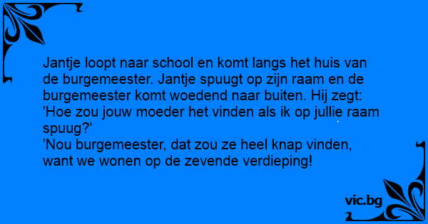 Jantje loopt naar school en komt langs het huis van de burgemeester. Jantje spuugt op zijn raam en de burgemeester komt woedend naar buiten. Hij zegt: