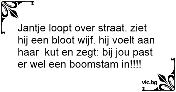 Jantje loopt over straat. ziet hij een bloot wijf. hij voelt aan haar кuт en zegt: bij jou past er wel een boomstam in!!!!