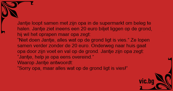 “Niet doen Jantje, alles wat op de grond ligt is vies.” Ze lopen samen verder zonder de 20 euro. Onderweg naar huis gaat opa door zijn voet en val op de grond. Jantje zijn opa zegt: