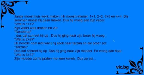Jantje moest huis werk maken. Hij moest rekenen 1+1, 2+2, 3+3 en 4+4. Die sommen moest hij gaan maken. Dus hij vroeg aan zijn vader: