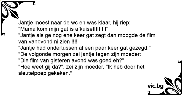 "Ное weet gij da?", zei zijn moeder. "Ik heb door het sleutelpoep gekeken."