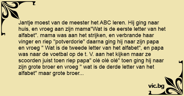 Jantje moest van de meester het ABC leren. Hij ging naar huis, en vroeg aan zijn mama"Wat is de eerste letter van het alfabet". mama was aan het strijken, en verbrande haar vinger en riep "potverdorie" daarna ging hij naar zijn papa en vroeg " Wat is de tweede letter van het alfabet", en papa was naar de voetbal op de t. V. aan het kijken maar ze scoorden juist toen riep papa" olé olé olé" toen ging hij naar zijn grote broer en vroeg " wat is de derde letter van het alfabet" maar grote broer was super man op de pc aan het spelen, hij won het spel en riep " i am superman" De volgende dag ging Jantje naar school , toen vroeg de meester noem het ABC op Jantje waarop Jantje antwoordde " potverdorie" waarop de meester riep " vloeken doen we niet in de klas, in de hoek jij" toen Jantje in de hoek stond zij hij "olé olé olé" daarop antwoordde de meester en zij " zeg wie denk je wel dat je веnт" waarop Jantje antwoordde " i am superman".