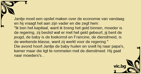 Jantje moet een opstel maken over de economie van vandaag en hij vraagt het aan zijn vader en die zegt hem: