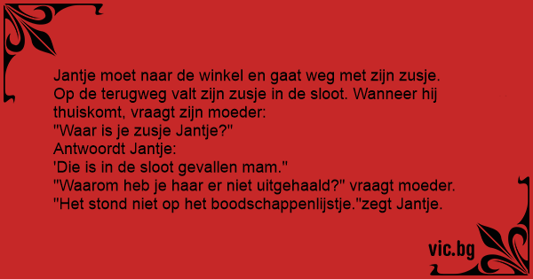 "Waarom heb je haar er niet uitgehaald?" vraagt moeder. "Het stond niet op het boodschappenlijstje."zegt Jantje.