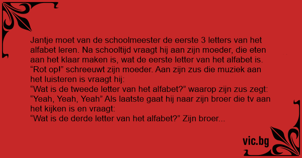 De volgende dag op school vraagt de meester aan jantje wat volgens hem de eerste letter van het alfabet is. Jantje antwoordt “Rot op!” De meester schrikt verbaasd op en zegt: