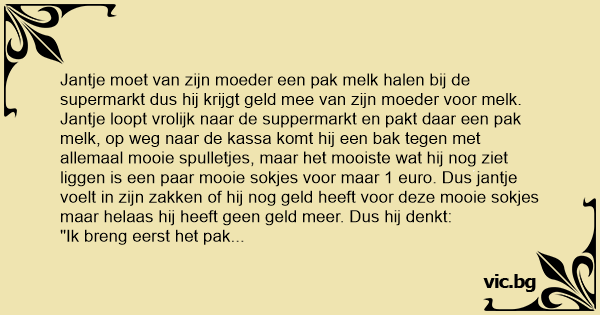Jantje moet van zijn moeder een pak melk halen bij de supermarkt dus hij krijgt geld mee van zijn moeder voor melk. Jantje loopt vrolijk naar de suppermarkt en pakt daar een pak melk, op weg naar de kassa komt hij een bak tegen met allemaal mooie spulletjes, maar het mooiste wat hij nog ziet liggen is een paar mooie sokjes voor maar 1 euro. Dus jantje voelt in zijn zakken of hij nog geld heeft voor deze mooie sokjes maar helaas hij heeft geen geld meer. Dus hij denkt: