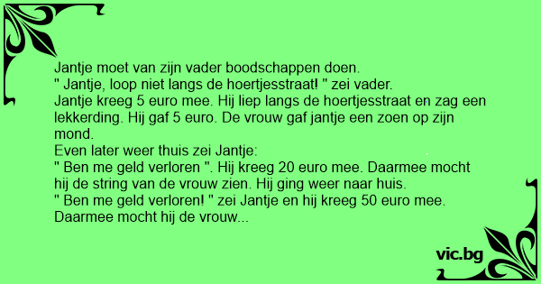 Jantje kreeg 5 euro mee. Hij liep langs de hoertjesstraat en zag een lekkerding. Hij gaf 5 euro. De vrouw gaf jantje een zoen op zijn mond.