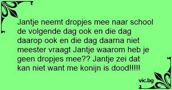 Jantje neemt dropjes mee naar school de volgende dag ook en die dag daarop ook en die dag daarna niet meester vraagt Jantje waarom heb je geen dropjes mee?? Jantje zei dat kan niet want me konijn is dood!!!!!