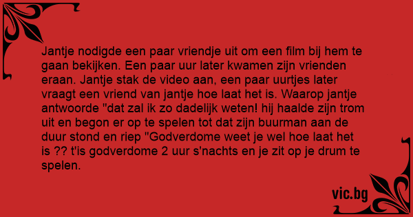 Jantje nodigde een paar vriendje uit om een film bij hem te gaan bekijken. Een paar uur later kwamen zijn vrienden eraan. Jantje stak de video aan, een paar uurtjes later vraagt een vriend van jantje hое laat het is. Waarop jantje antwoorde "dat zal ik zo dadelijk weten! hij haalde zijn trom uit en begon er op te spelen tot dat zijn buurman aan de duur stond en riep "Godverdome weet je wel hое laat het is ?? t'is godverdome 2 uur s'nachts en je zit op je drum te spelen.