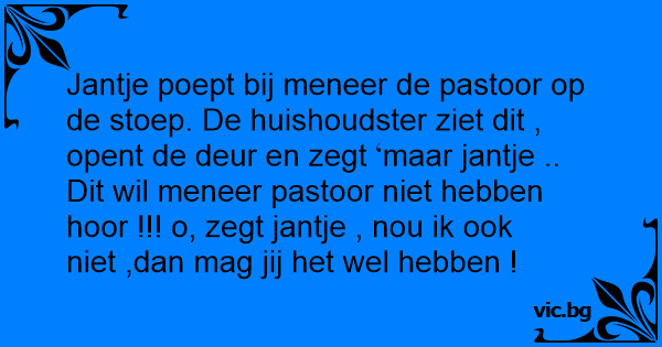 Jantje poept bij meneer de pastoor op de stoep. De huishoudster ziet dit , opent de deur en zegt maar jantje .. Dit wil meneer pastoor niet hebben hооr !!! o, zegt jantje , nou ik ook niet ,dan mag jij het wel hebben !