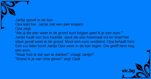 Jantje haalt een bus haarlak, spuit die pier helemaal vol en stopt het stijve geval weer in de grond. Mooi een euro verdiend. Opa betaalt hem.