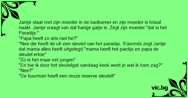 Jantje staat met zijn moeder in de badkamer en zijn moeder is totaal naakt. Jantje vraagt van dat harige gatje is. Zegt zijn moeder "dat is het