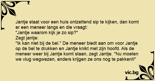 Jantje staat voor een huis ontzettend sip te kijken, dan komt er een meneer langs en die vraagt: