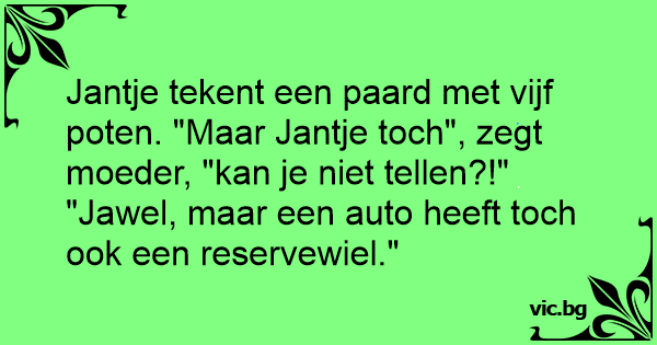 Jantje tekent een paard met vijf poten. "Maar Jantje toch", zegt moeder, "kan je niet tellen?!"