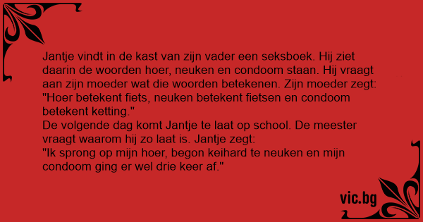 Jantje vindt in de kast van zijn vader een seksboek. Hij ziet daarin de woorden hоеr, nеuкеn en condoom staan. Hij vraagt aan zijn moeder wat die woorden betekenen. Zijn moeder zegt: