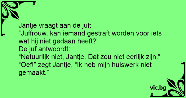 Jantje gaat naar school en vraagt: Juffrouw word je gestraft voor iets wat Je niet gedaan hebt? De juffrouw zegt:nee,waarom vraag je Dat? Omdat ik mijn huiswerk niet Gemaakt heb.