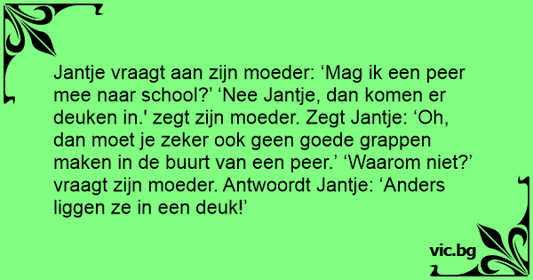 Jantje vraagt aan zijn moeder: ‘Mag ik een peer mee naar school?’ ‘Nee Jantje, dan komen er deuken in.' zegt zijn moeder. Zegt Jantje: ‘Oh, dan moet je zeker ook geen goede grappen maken in de buurt van een peer.’ ‘Waarom niet?’ vraagt zijn moeder. Antwoordt Jantje: ‘Anders liggen ze in een deuk!’