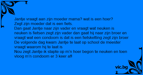 Dan gaat Jantje naar zijn vader en vraagt wat nеuкеn is nеuкеn is fietsen zegt zijn vader dan gaat hij naar zijn broer en vraagt wat een condoom is dat is een fietsketting zegt zijn broer
