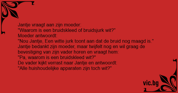 Синот ја прашува мајка си: - Мамо, зошто венчаниците се бели? Мајката одговора: - Венчаницата покажува на пријателите и Роднините дека невестата е чиста. Синот за секој случај го прашува истото...