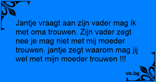Jantje vraagt aan zijn vader mag ik met oma trouwen. Zijn vader zegt nee je mag niet met mij moeder trouwen. jantje zegt waarom mag jij wel met mijn moeder trouwen !!!