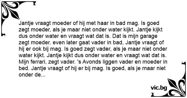 Jantje vraagt moeder of hij met haar in bad mag. Is goed zegt moeder, als je maar niet onder water kijkt. Jantje kijkt dus onder water en vraagt wat dat is. Dat is mijn garage zegt moeder. even later gaat vader in bad, Jantje vraagt of hij er ook bij mag. Is goed zegt vader, als je maar niet onder water kijkt. Jantje kijkt dus onder water en vraagt wat dat is. Mijn ferrari, zegt vader. 's Avonds liggen vader en moeder in bed. Jantje vraagt of hij er bij mag. Is goed, als je maar niet onder de dekens kijkt zeggen vader en moeder. Jantje kijkt onder de dekens en vraagt wat ze aan het doen zijn. Vader antwoord, ik parkeer mijn ferrari in de garage. Oke, zegt Jantje, kan mijn scooter er ook nog bij?