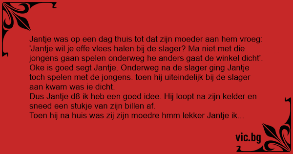 'Jantje wil je effe vlees halen bij de slager? Ma niet met die jongens gaan spelen onderweg he anders gaat de winkel dicht'. Oke is goed segt Jantje. Onderweg na de slager ging Jantje toch weer spelen met de jongens. toen hij uiteindelijk bij de slager aan kwam was ie dicht. Hij liep weer na de kelder en sneed weer een stuk van zijn billen af. Toen zij zijn moeder weer hmm jantje wat was dat lekker seg je moet morgen weer na de slager om deze heerlijke stuk vlees te halen. Toen jantje antwoorde ' Nee mama want mijn billen zijn helaas op!'