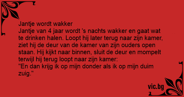 Jantje van 4 jaar wordt 's nachts wakker en gaat wat te drinken halen. Loopt hij later terug naar zijn kamer, ziet hij de deur van de kamer van zijn ouders open staan. Hij kijkt naar binnen, sluit de deur en mompelt terwijl hij terug loopt naar zijn kamer: