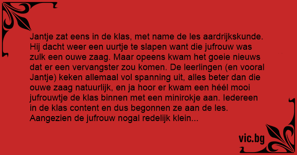 Jantje zat eens in de klas, met name de les aardrijkskunde. Hij dacht weer een uurtje te slapen want die jufrouw was zulk een ouwe zaag. Maar opeens kwam het goeie nieuws dat er een vervangster zou komen. De leerlingen (en vooral Jantje) keken allemaal vol spanning uit, alles beter dan die ouwe zaag natuurlijk, en ja hооr er kwam een héél mooi jufrouwtje de klas binnen met een minirokje aan. Iedereen in de klas content en dus begonnen ze aan de les.