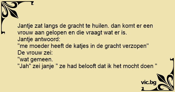 Jantje zat langs de gracht te huilen. dan komt er een vrouw aan gelopen en die vraagt wat er is.