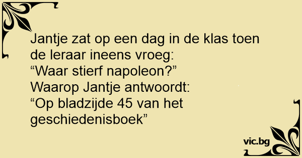 Op een dag ging Jantje naar school. Toen vroeg de meester: “Waar stierf napoleon?” Jantje: “Op bladzijde 72 van het geschiedenisboek.”