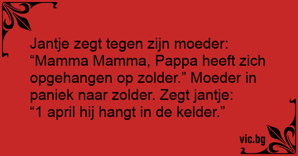 “Mamma Mamma, Pappa heeft zich opgehangen op zolder.” Moeder in paniek naar zolder. Zegt jantje: