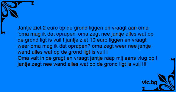 Jantje ziet 2 euro op de grond liggen en vraagt aan oma 'oma mag ik dat oprapen' oma zegt nee jantje alles wat op de grond ligt is vuil ! jantje ziet 10 euro liggen en vraagt weer oma mag ik dat oprapen? oma zegt weer nee jantje wand alles wat op de grond ligt is vuil !