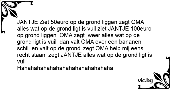 JANTJE Ziet 50euro op de grond liggen zegt OMA alles wat op de grond ligt is vuil ziet JANTJE 100euro op grond liggen OMA zegt weer alles wat op de grond ligt is vuil dan valt OMA over een bananen schil en valt op de grond' zegt OMA help mij eens recht staan zegt JANTJE alles wat op de grond ligt is vuil