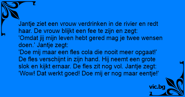 'Doe mij maar een fles cola die nooit meer opgaat!' De fles verschijnt in zijn hand. Hij neemt een grote slok en kijkt ernaar. De fles zit nog vol. Jantje zegt: